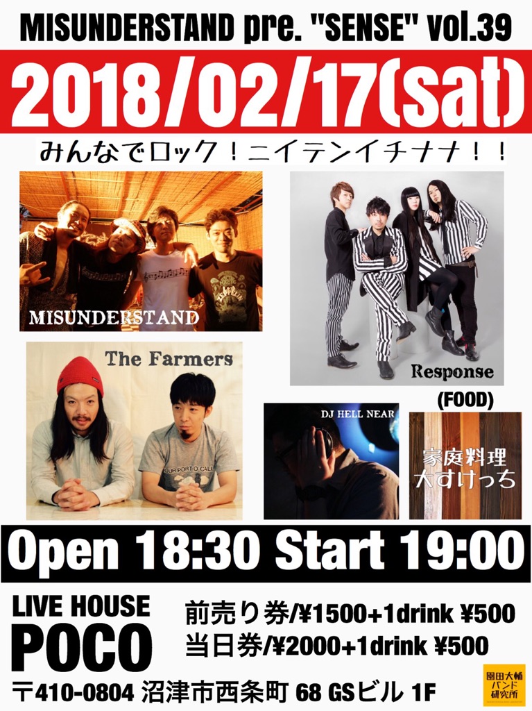 沼津POCO MISUNDERSTAND presents 『SENSE vol.39』 出演 MISUNDERSTAND THE FARMERS(東京) Response(東京) DJ 高木ヒロタカ(Hell-Near) 家庭料理 大すけっち (協力:パンの梢月) 開場 18:30 開演19:00 チケット 前売 1500円(+1ドリンク500円) 当日 2000円(+1ドリンク500円) ※小学生以下は入場無料 学生は受付で学生証をお見せください! 学割で1000円(+1ドリンク500円)で 入場できます! |